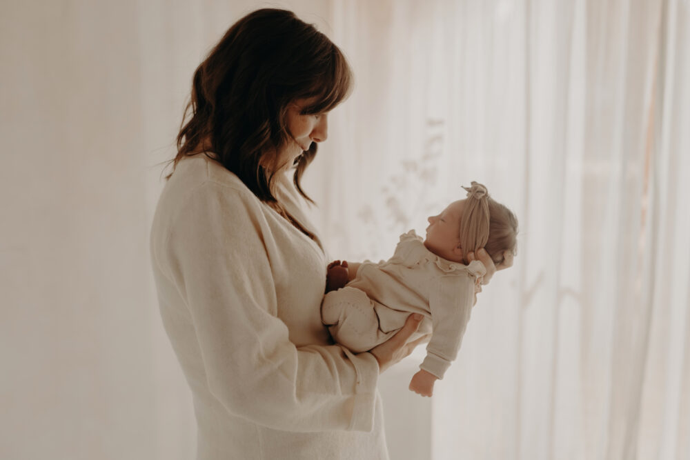 Sanfte Hauttöne, weiches Fensterlicht und die Nähe zwischen den beiden machen diese Motive so wertvoll für ein Babyshooting.